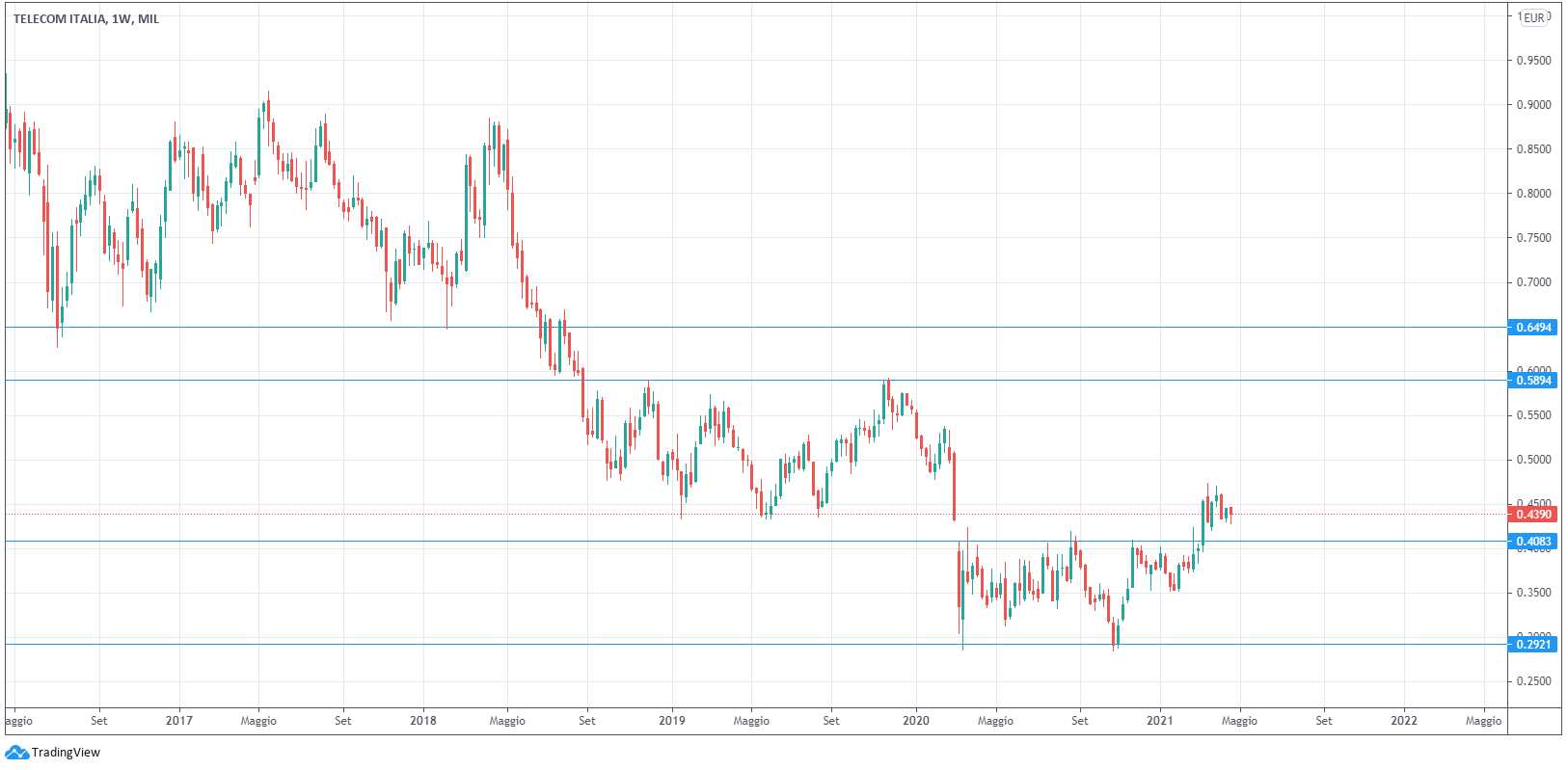 Per capire meglio la rilevanza dei livelli di supporto e di resistenza si osservi il seguente grafico settimanale del titolo Telecom, quotato a Piazza Affari.