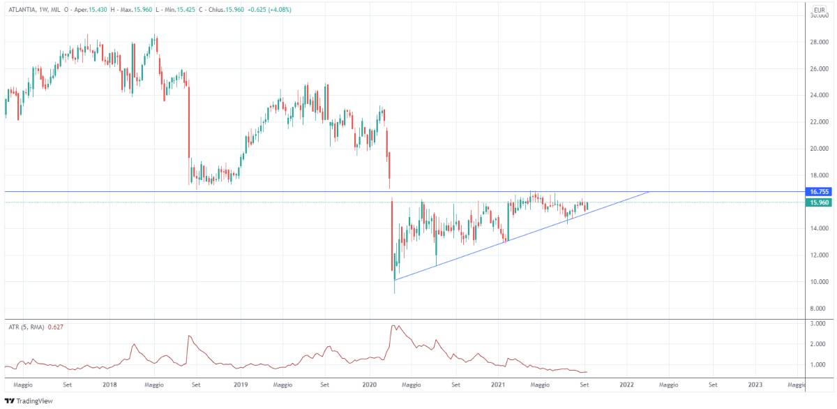 Osservando il grafico del titolo Atlantia su timeframe settimanale, è possibile evidenziare una situazione potenzialmente molto interessante. Dopo il forte ribasso che ha colpito il titolo tra la metà di febbraio e la metà di marzo 2020, quindi in corrispondenza dello scoppio della pandemia da Covid-19, il mercato ha sviluppato una fase di trading range che, secondo la teoria classica dell’analisi tecnica, ha creato una figura nota come “triangolo ascendente”, caratterizzata da massimi posizionati all’incirca sullo stesso livello e minimi crescenti. E’ possibile notare come la progressiva salita dei minimi sia più ripida rispetto ai massimi che tendono, invece, a sviluppare un andamento più laterale. I massimi più recenti della figura, inoltre, sono posizionati sul livello di resistenza in area 16,75 euro che, in precedenza, aveva assunto il ruolo di supporto, respingendo un tentativo di ribasso delle quotazioni.