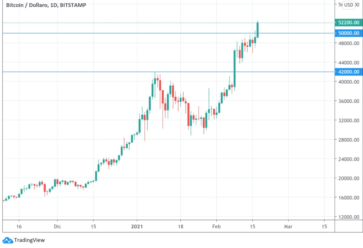 Nelle giornate del 16 e 17 Febbraio, il Bitcoin ha prima toccato e poi superato con decisione quota 50.000 dollari facendo, così, registrare un nuovo massimo storico. Questo evento rappresenta il culmine di un forte rally che ha caratterizzato le quotazioni della criptovaluta, soprattutto a partire dalla fine di Ottobre 2020. All’inizio dello stesso mese il Bitcoin quotava circa 10.000 dollari, il che significa che da quel momento ad oggi lo strumento ha fatto registrare una salita del 400% (da area 10.000 fino ad area 50.000 dollari) in soli 4 mesi.