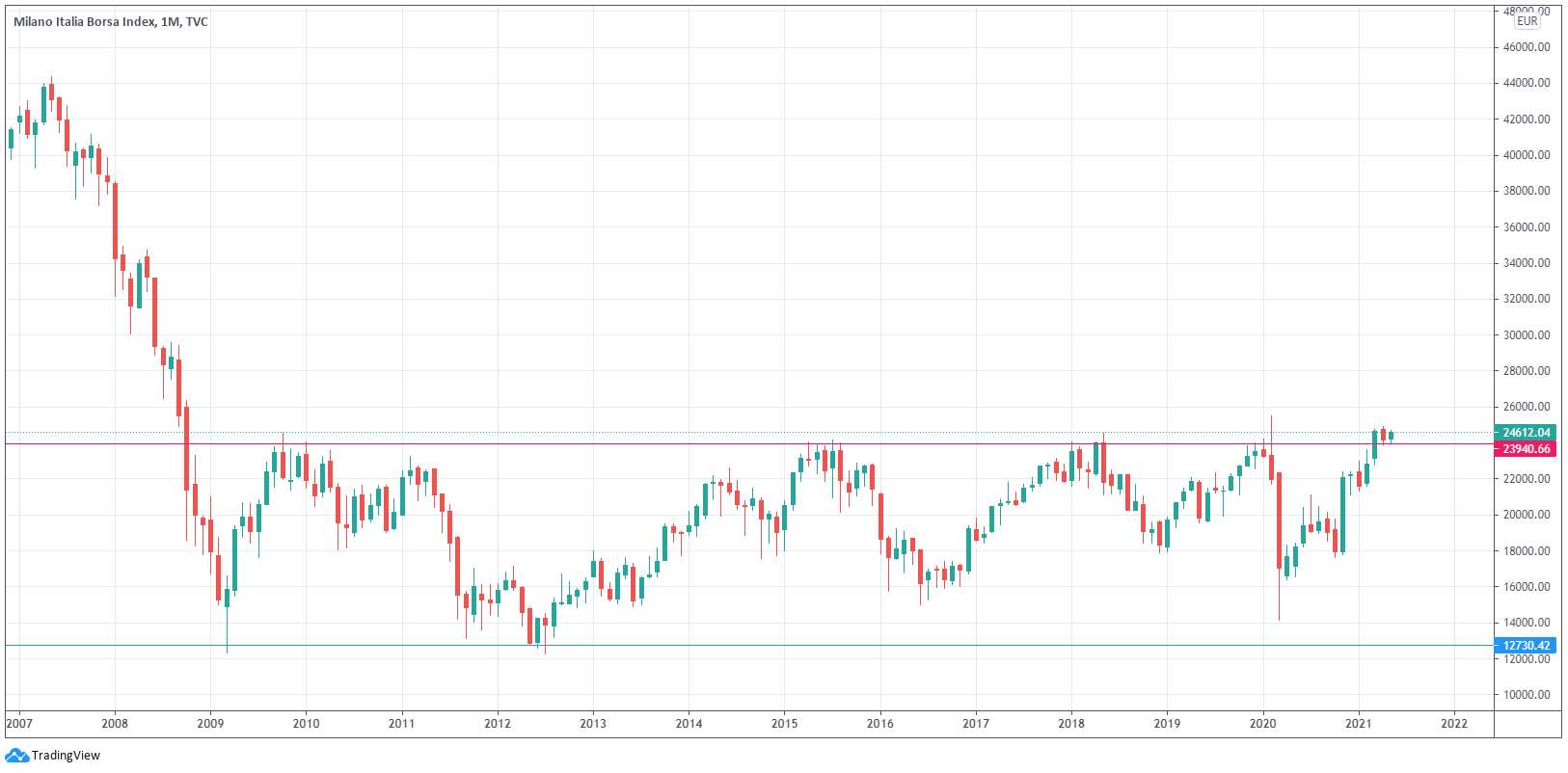 Osservando il grafico del FTSE MIB e cercando di interpretarlo secondo le teorie dell’analisi tecnica, le prospettive sembrerebbero opposte rispetto a quelle che ci vengono suggerite dagli studi statistici. In particolare, è interessante analizzare l’indice su timeframe settimanale e mensile.
