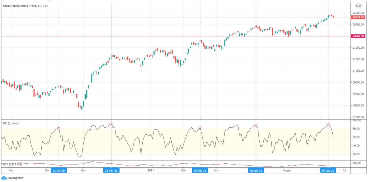 Nel grafico qui proposto, sono stati messi in evidenza gli altri momenti in cui, a partire da settembre 2020, l’RSI ha superato il livello di 80, ovvero la soglia di ipercomprato che individua un eccesso di rialzo e, dunque, una probabile ed imminente correzione ribassista. Si può apprezzare come la normale dinamica del mercato preveda dei periodi di interruzione del trend dominante, durante i quali il mercato frena la propria corsa, consentendo all’oscillatore di ritornare nella zona neutrale, prima di tornare a spingere al rialzo. Molto probabilmente ciò accadrà anche in questo caso e, dopo un periodo di debolezza, la cui durata non dovrebbe essere molto estesa, Piazza Affari dovrebbe tornare a salire e ad aggiornare i massimi dell’anno.