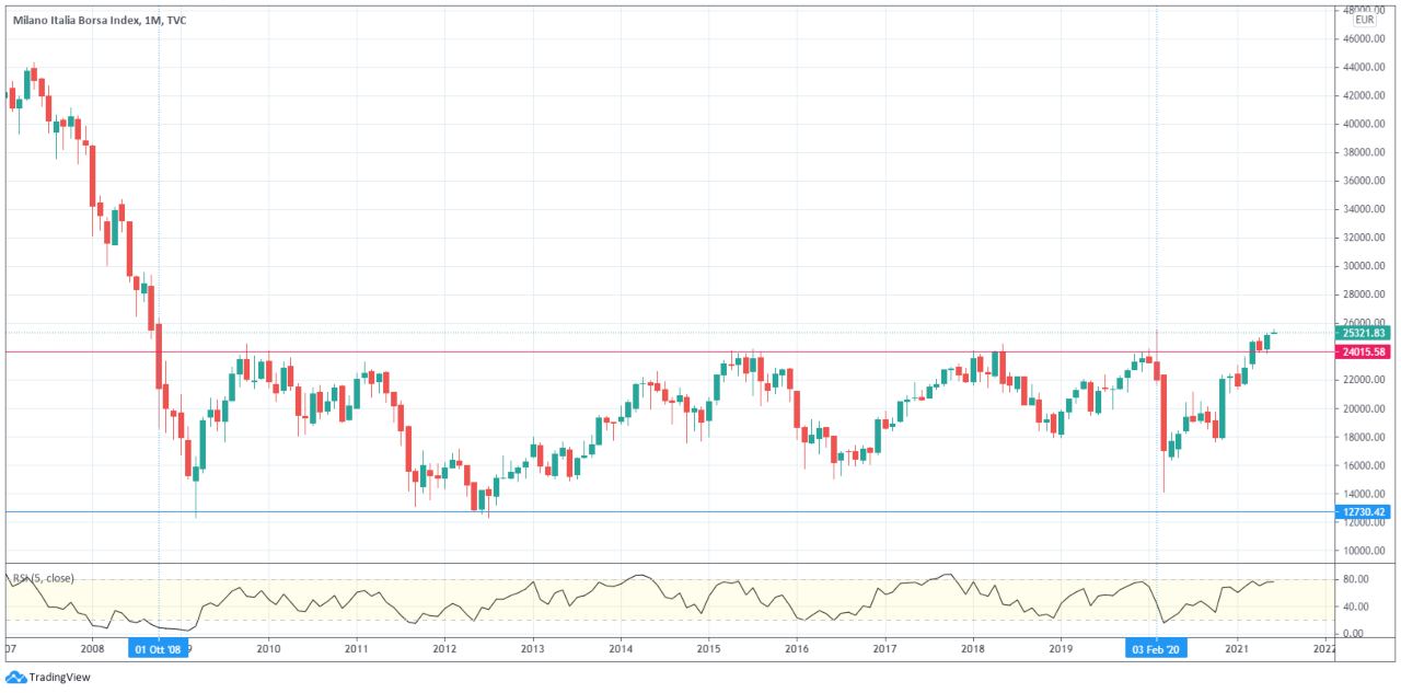Innanzitutto, è importante osservare come l’indice abbia raggiunto oggi un massimo di 25.553 punti, ovvero un livello che non veniva toccato dall’ottobre del 2008, quasi 13 anni fa. In secondo luogo, ma non per importanza, si rileva la formazione, in seguito alla chiusura del mese di maggio avvenuta ieri, di un pattern “bullish engulfing”: ciò significa che la candela rialzista del mese di maggio racchiude con il proprio range (differenza massimo-minimo) la candela ribassista di aprile. In altri termini, dopo aver toccato un minimo più basso, rispetto a quello registrato nel mese di aprile, durante il mese di maggio i compratori hanno riacquistato il controllo del mercato e la candela ha chiuso ben al di sopra del massimo di aprile. Si tratta di un ottimo segnale di forza dell’azionario italiano, che segue, inoltre, il breakout sia di area 24.000 punti indice (resistenza che bloccava i tentativi di rialzo da oltre 10 anni, come si può notare dal grafico) che dei 25.000 punti.