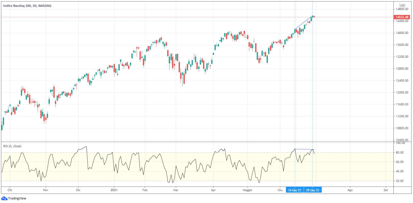 La debolezza relativa del Nasdaq 100, indice composto dalle più importanti società del settore tecnologico, è legata ai forti rialzi che hanno caratterizzato tale indice nel mese di giugno, oltre che da inizio anno. Gli oscillatori evidenziano, infatti, una situazione di ipercomprato, su timeframe giornaliero, che potrebbe rappresentare il preludio di una correzione ribassista nei prossimi giorni. Inoltre, come è possibile notare dal grafico in basso, l’oscillatore RSI evidenzia anche una divergenza ribassista, in quanto i prezzi hanno segnato un massimo superiore al precedente, mentre, nello stesso intervallo di tempo, l’ultimo picco del Relative Strength Index è più basso del precedente. Si tratta di un possibile segnale ribassista, che si completerebbe qualora si verificassero due condizioni: